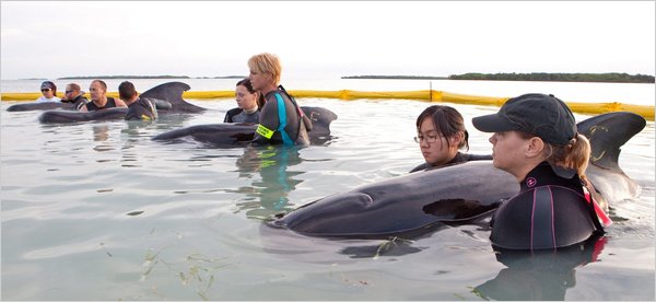 The remaining three whales from a pod of 23 are struggling to stay alive at the Marine Mammal Conservancy center in Key Largo, Florida. The pod of 23 became stranded in shallow water, and unfortunately most of the gargantuan mammals perished in the dry conditions. Human caretakers at the conservancy are doing all they can to help the final few stay alive. NY TIMES