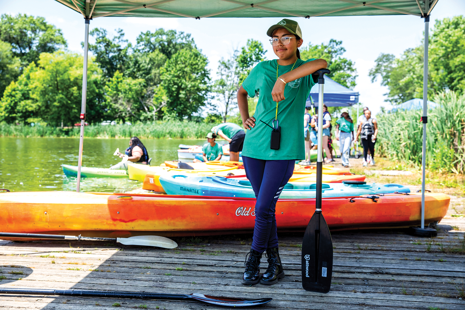 On an unseasonably cool Saturday during one of this spring’s stretches of wet weather, Yazmine Acosta, a 14-year-old from South Philadelphia, greeted visitors at a lakeside dock at Franklin Delano Roosevelt Park, just across Broad Street from the Wells Fargo Center. Her slender arms outstretched, she demonstrated how to swoop a paddle’s ends in and out of the water in a figure eight fashion, instructing people twice her size and three times her age on proper kayaking technique.