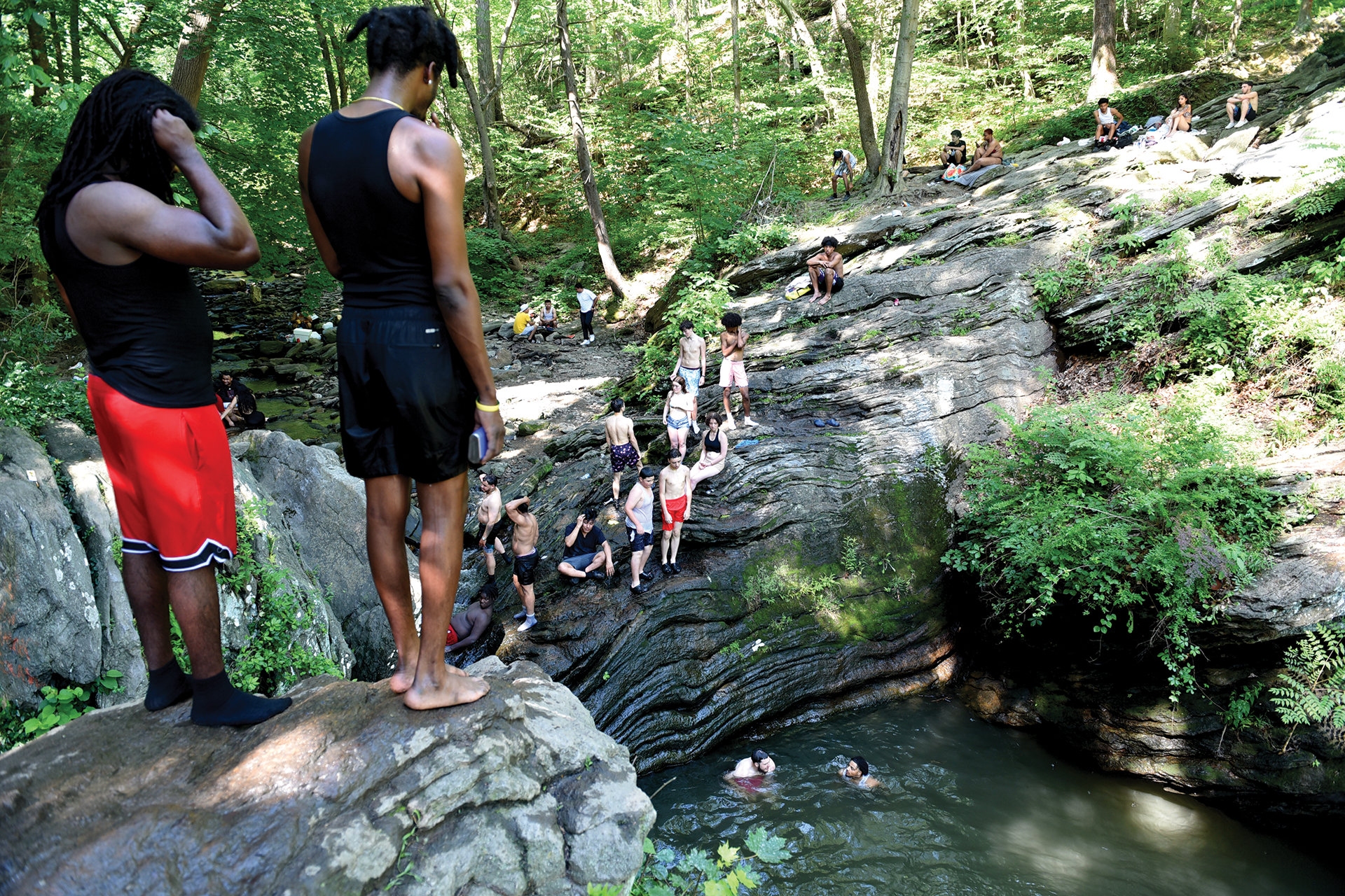 They weren’t alone. Some two hundred people had gathered at the spot: a group of friends playing dominos on the rocky delta of the creeks’ confluence as smoke wafted from a grill, an immigrant from India keeping close eye on his three young boys wading nearby, scores of people swimming and two dozen more waiting their turn to cliff dive into the water.