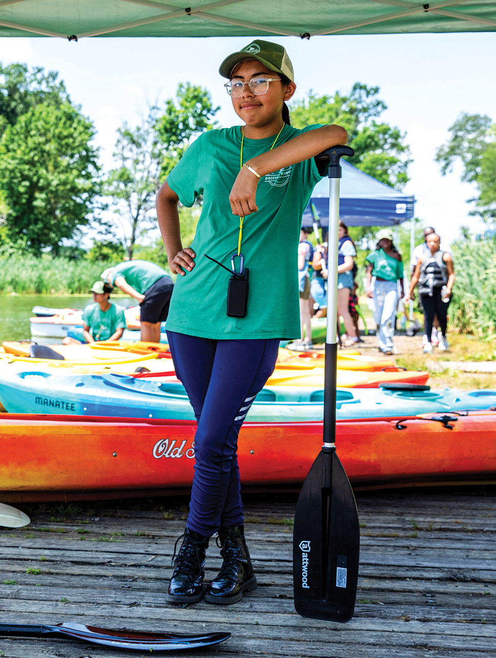 On an unseasonably cool Saturday during one of this spring’s stretches of wet weather, Yazmine Acosta, a 14-year-old from South Philadelphia, greeted visitors at a lakeside dock at Franklin Delano Roosevelt Park, just across Broad Street from the Wells Fargo Center. Her slender arms outstretched, she demonstrated how to swoop a paddle’s ends in and out of the water in a figure eight fashion, instructing people twice her size and three times her age on proper kayaking technique.