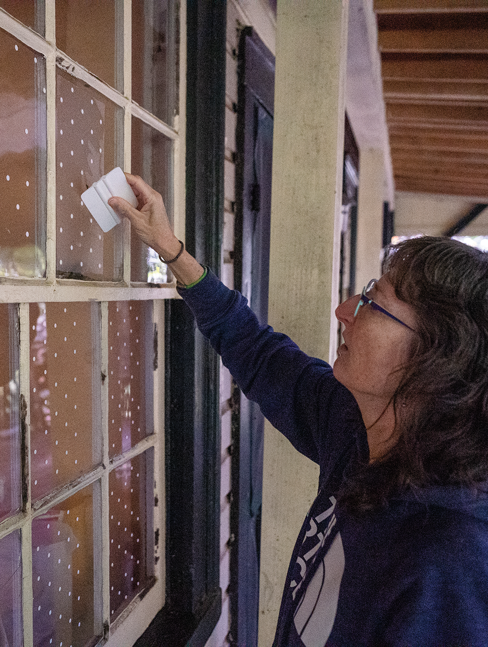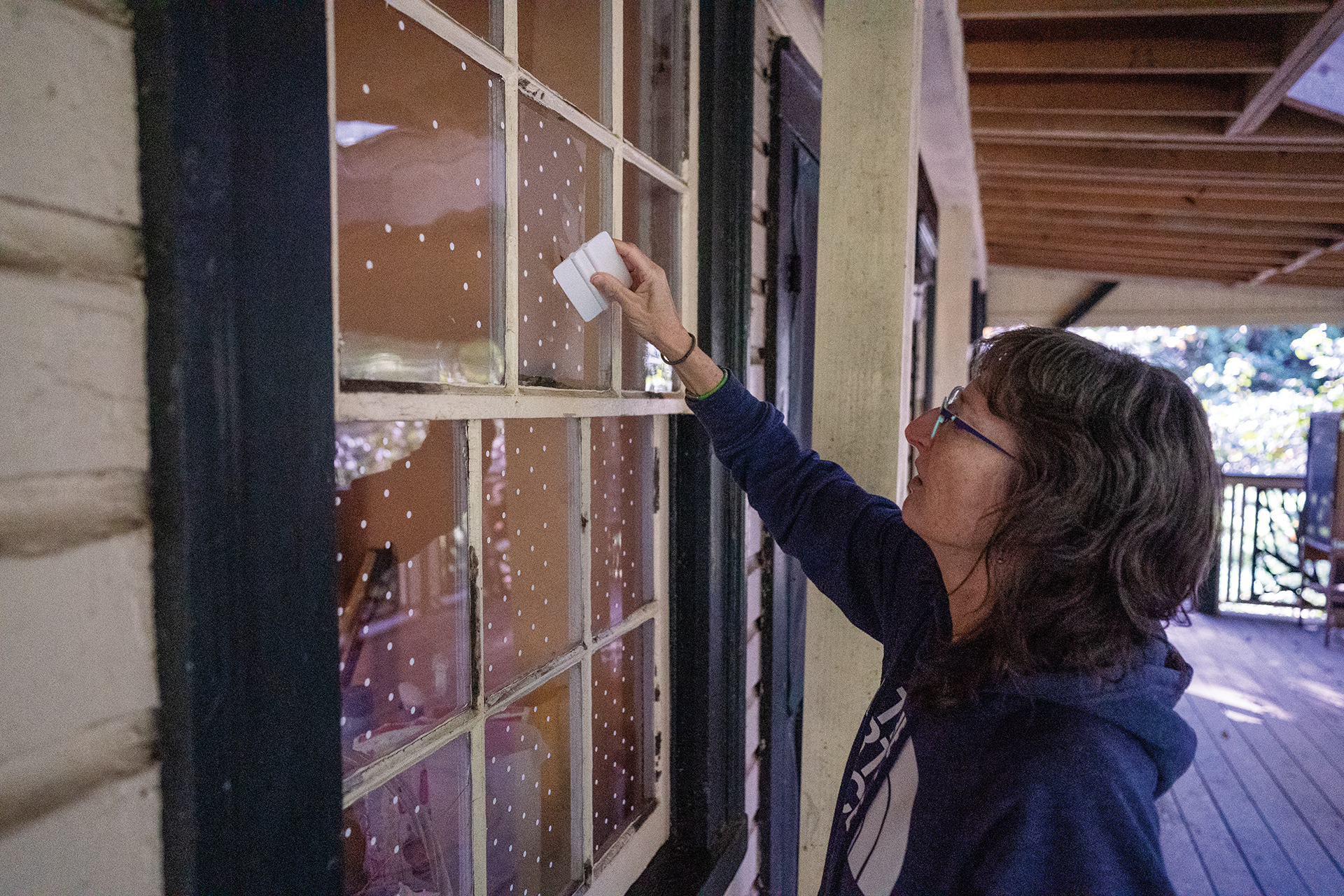 Bird Safe Philly volunteer Katie Eberhart protects birds from running into the glass at the Wissahickon Environmental Center. Photo by Chris Baker Evens.