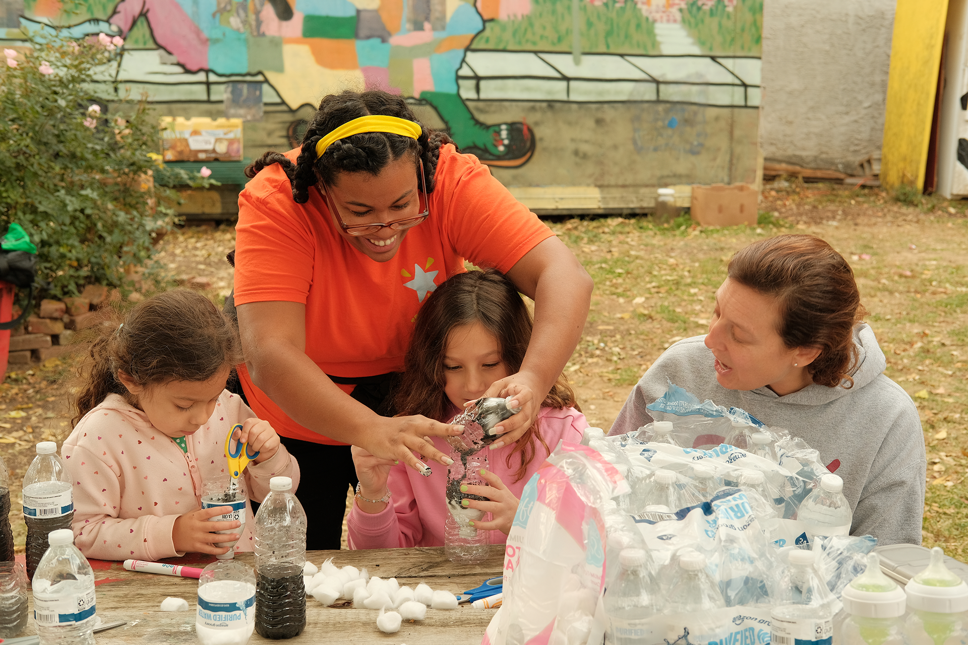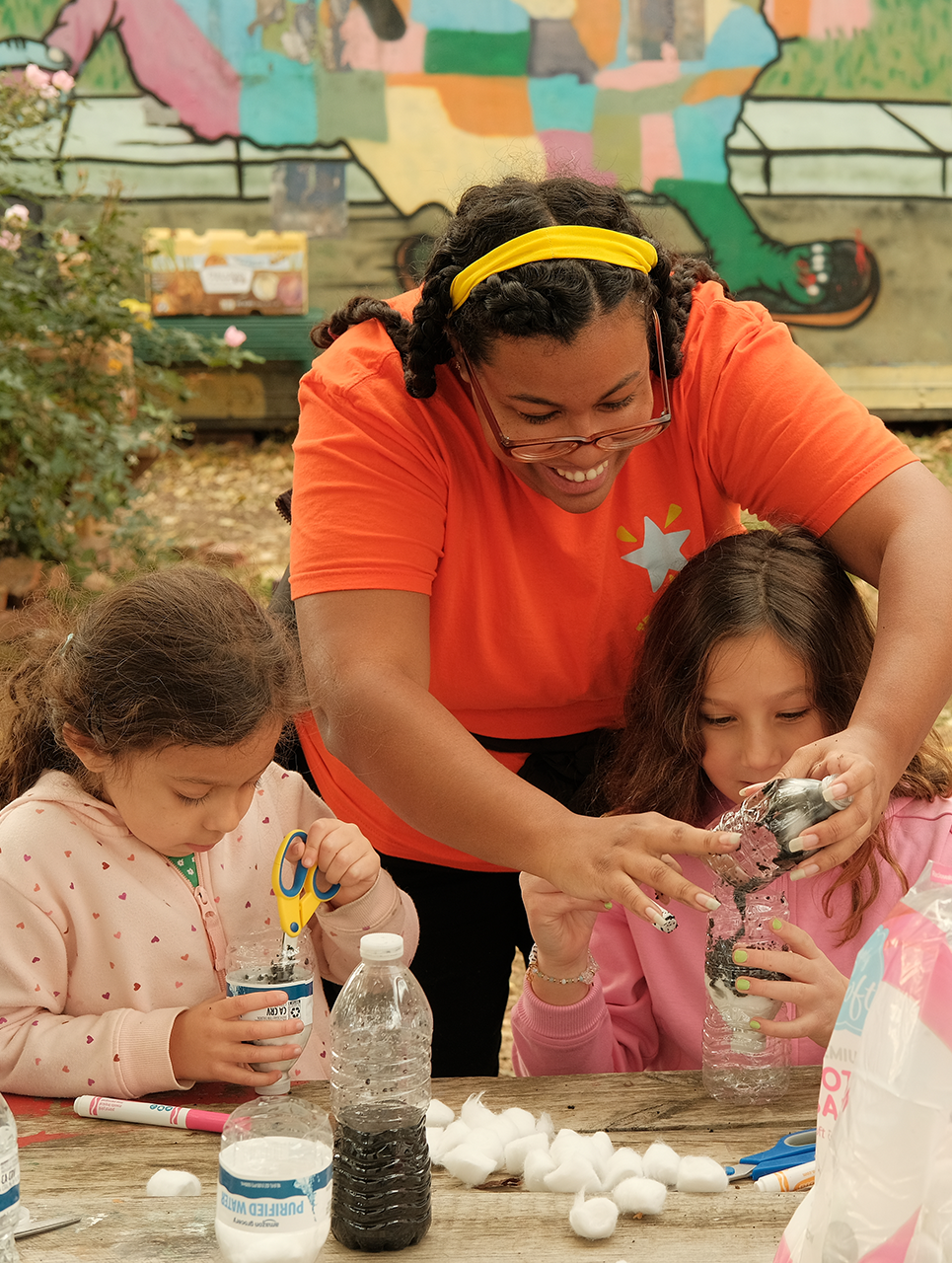 At Peace Park, Reynoso-Morris led the participants in flipping the tops of their cut water bottles upside down and into their bases for the drip process. They then stuffed the tops, layering materials — cleansing rocks, sand, charcoal and cotton balls — in order, creating increasing levels of filtration.
