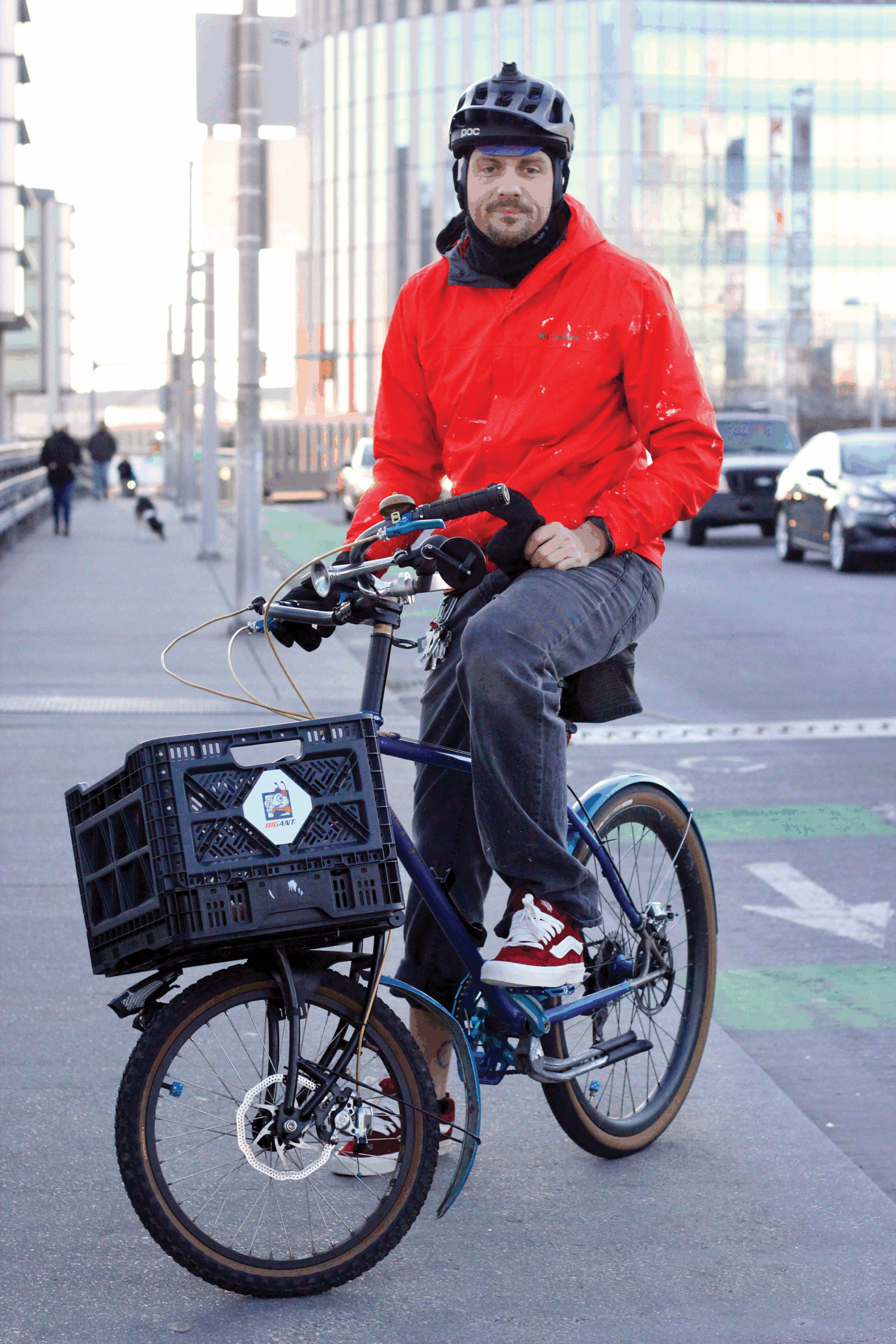 “I work at Neighborhood Bike Works. Bikes are a very large portion of my life. It’s pretty integral to my transportation, my mental health as well. It’s my outlet for doing something creative and active. This is my cargo bike. It’s an old mountain bike that I scored off eBay for super cheap. I put a Crust [brand cargo] fork on it and made it into my grocery-getter. I’ve got some errands to run after work, so I’ve been riding this thing, but it’s very slow and it’s a lot to push.”