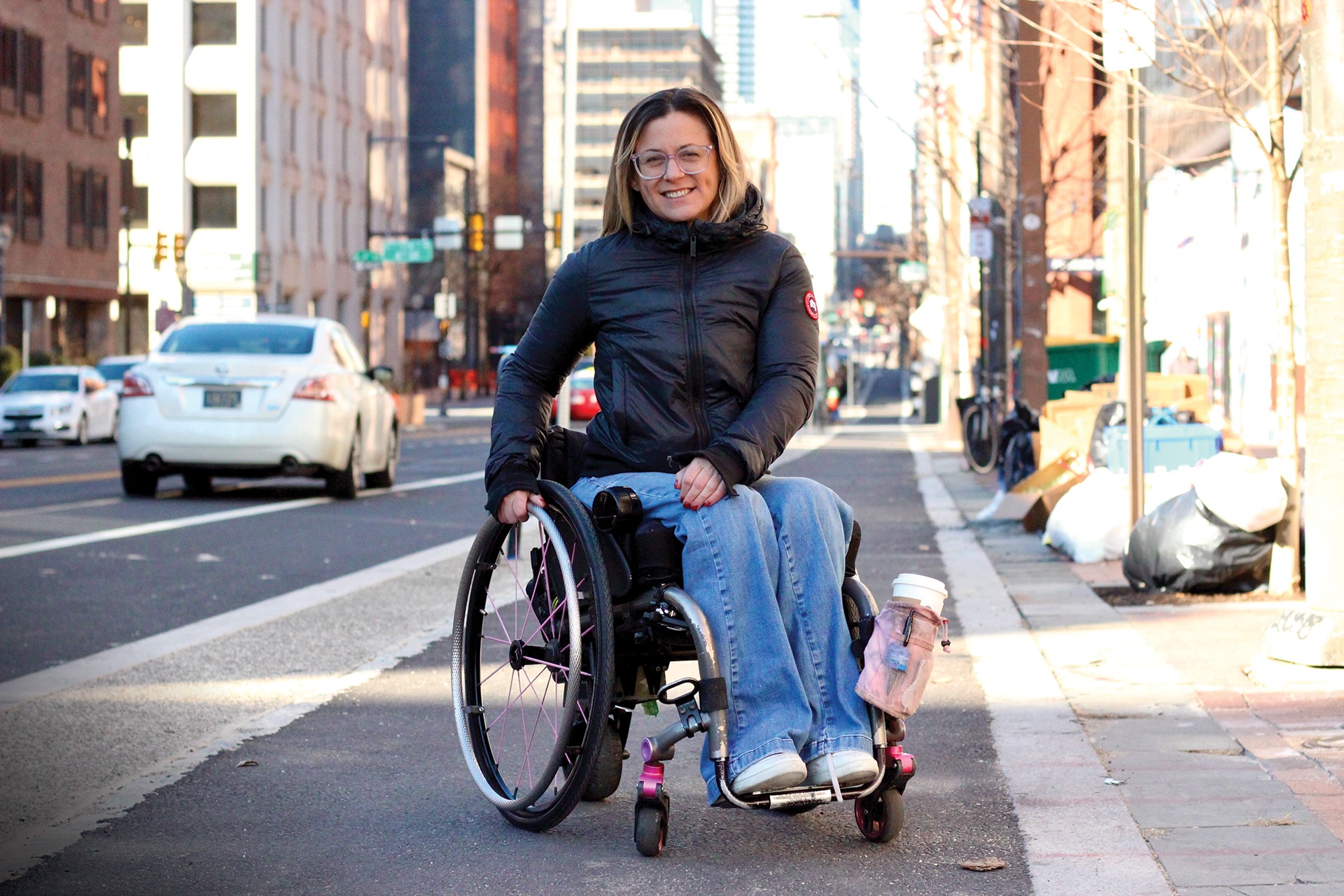 Parezo once loved cycling around Philadelphia. But in 2021, after a game of kickball at Hancock Playground in East Kensington, she was struck in the back by a stray bullet and paralyzed from the waist down. Now, she gets around town using a wheelchair. She rolls from her condo in Old City to her job at Thomas Jefferson University, where she teaches occupational therapy. In a city where sidewalks are often damaged or blocked, Parezo often ends up rolling into a bike lane.