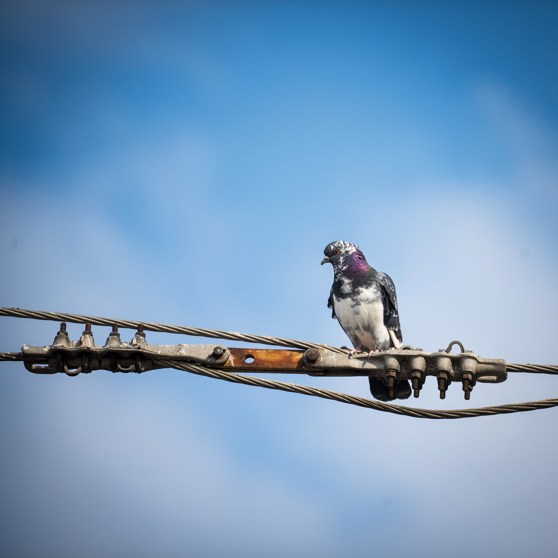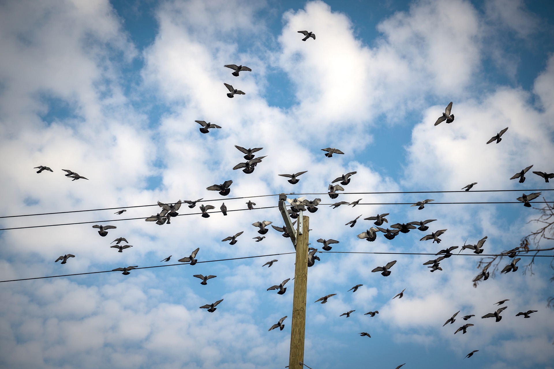 The pigeons did what pigeons do. Mostly, they sat facing the wind. If any pigeon tried to wedge itself in too close to its neighbors, it got pecked until it tried a different spot. Some puffed up and cooed at a neighbor. Then, with a shock of loud warning claps, they would all take off and wheel about over the streets and rooftops before alighting again on the power lines.