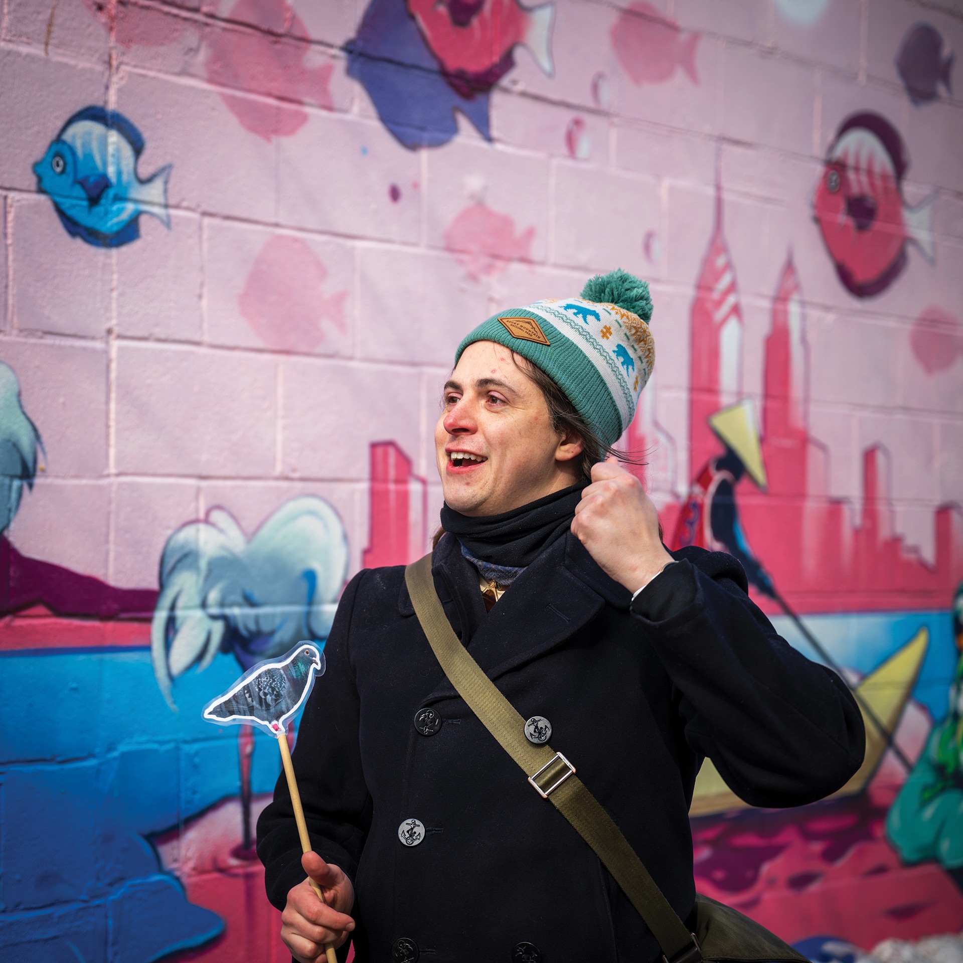 At 11 a.m. on Valentine’s Day, Aspen Simone stood on the corner of 7th and Christian streets in South Philadelphia holding a long dowel with a laminated, cutout pigeon on the end.