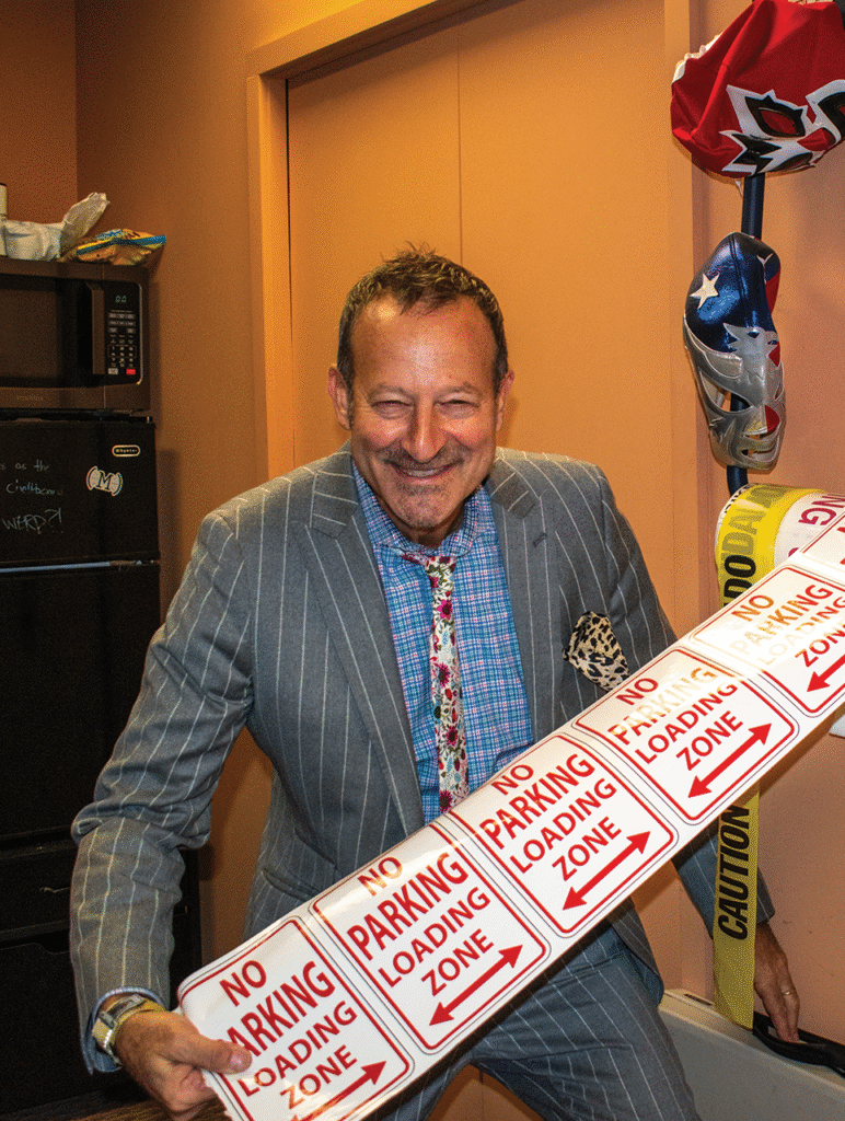 MoreThe entrance to Stuart Leon’s office is adorned with a rack of luchador masks and rolls of “Loading Zone” stickers. Life-size cardboard cutouts of Leon and his legal team welcome guests into the office’s nerve center, where Stuart Leon Bicycle Crash Law T-shirts spill from the shelves. From under a pile of brightly patterned neckties,