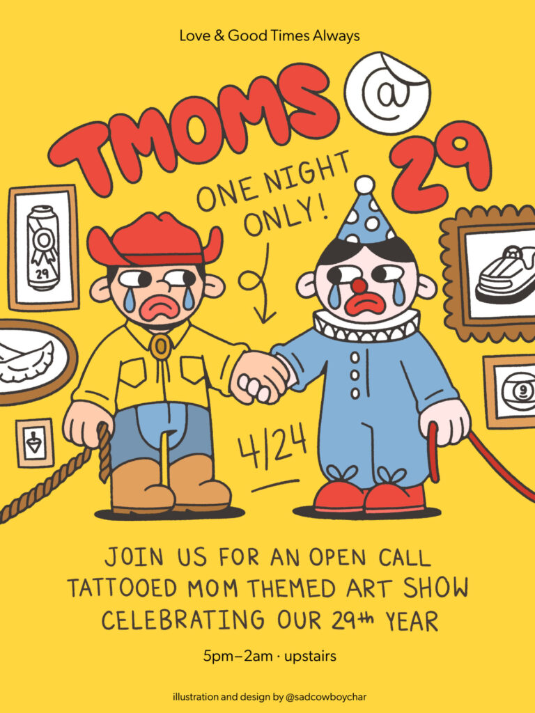 It’s Tattooed Mom’s 29th birthday! To celebrate, we’re throwing a one-night-only party & open call art show featuring TMoms-themed & TMoms-inspired art! Every year, hundreds of artists from around the world visit Tattooed Mom to put their work on the walls and see the art of other creatives who have recently passed through. This event
