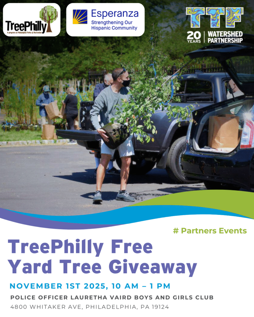 Esperanza, Tookany/Tacony Frankford Watershed Partnerships, and TreePhilly invite you to plant a free tree in your yard!  This Registration form is exclusively for planting addresses in the following Zip Codes: 19120, 19124, 19134, 19140, 19149 For information about all of TreePhilly’s giveaway opportunities, visit  TreePhilly.org.  To sign up for a free tree planted between the