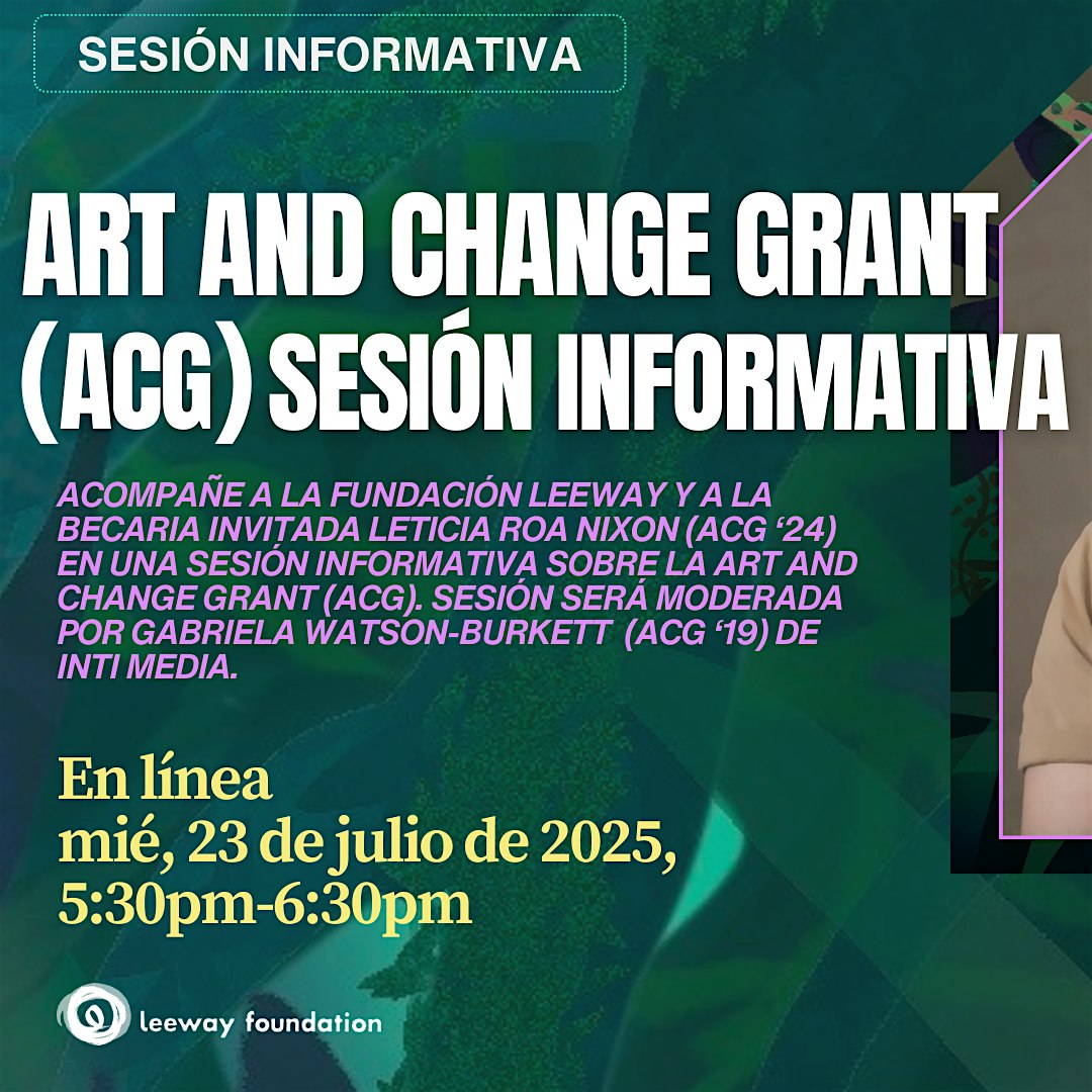 Acompañe a la Fundación Leeway y a la becaria invitada Leticia Roa Nixon (ACG ’09, ’14, ’24) en una sesión informativa sobre la Art and Change Grant (ACG). Durante la sesión, Leticia compartirá la experiencia que tuvo al solicitar la ACG. Descargue la solicitud y entérese de la ACG aquí, antes de la fecha límite del 1 de agosto. Esta sesión será moderada por Gabriela Watson-Burkett (ACG ’19, LTA ’22) de Inti Media.