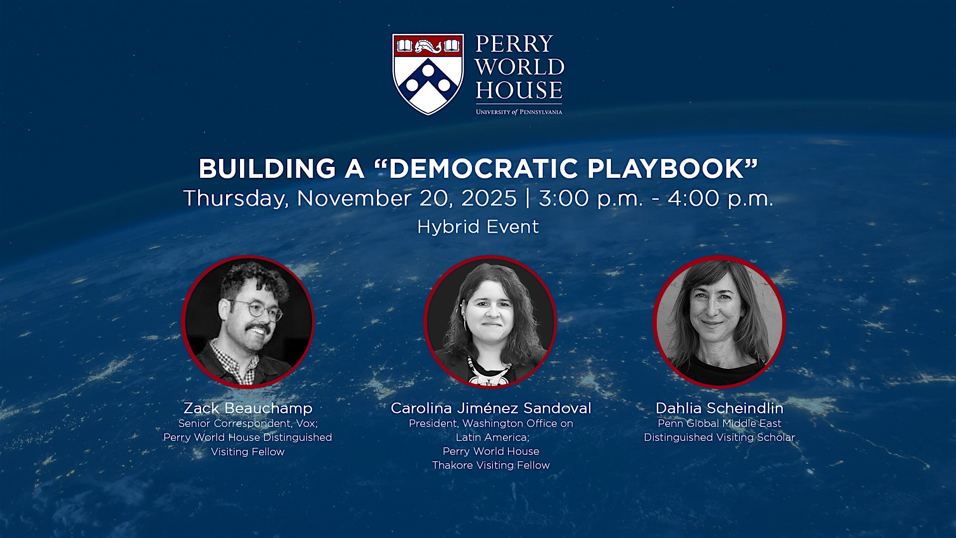 Perry World House is pleased to host a special conversation on democratic resilience with Penn Global’s Middle East Distinguished Visiting Professor Dahlia Scheindlin and Perry World House Distinguished Visiting Fellows Zack Beauchamp and Carolina Jiménez Sandoval.