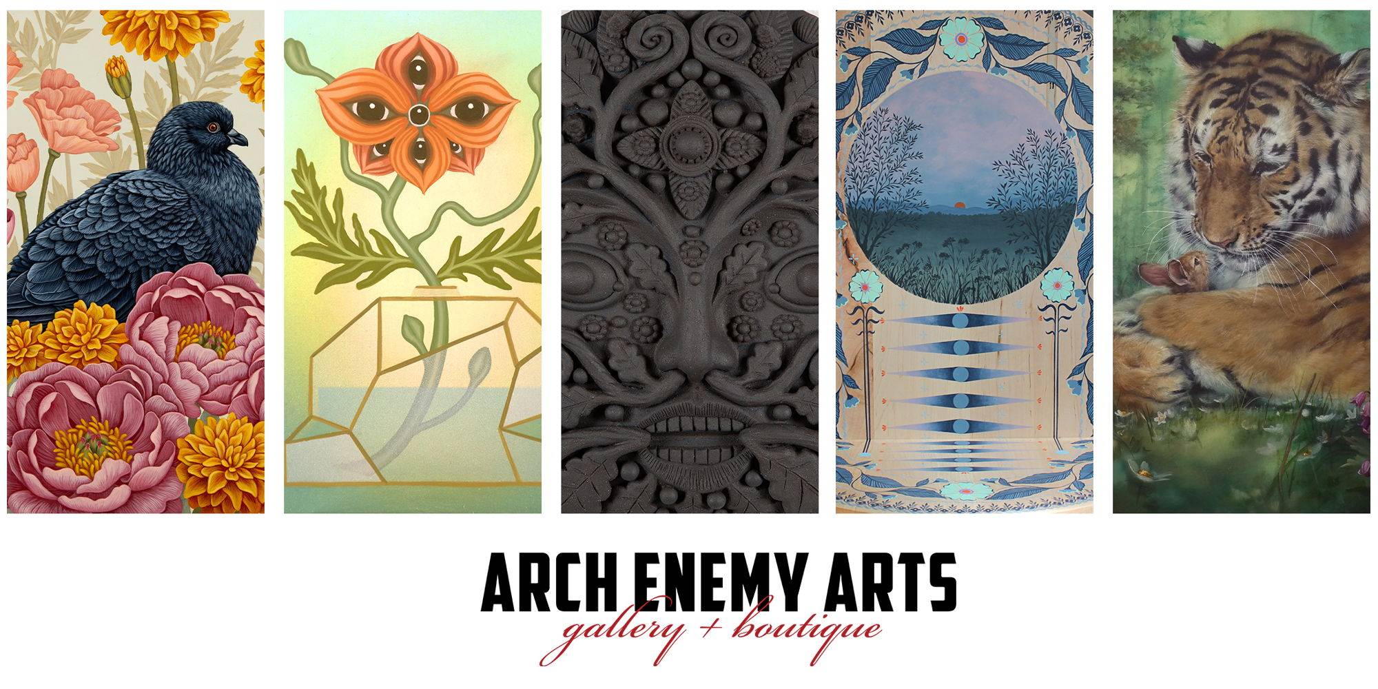 Join Arch Enemy Arts on First Friday, May 1st for the opening reception of six new shows, including the third installment of “Brings May Flowers,” a group exhibition celebrating spring and the vibrant beauty of blooms in all their beloved forms. View previous works from this ongoing series on our website here. Dewi Plass – Netherlands-based painter, Dewi Plass is known for her soft, atmospheric portrayals of animals. Here, she presents a deeply personal body of work shaped by profound loss and rooted in reflection, memory, and love. Holly Jean Studios – Local artist Corinne Lalik, creator of Holly Jean Studios, debuts her first gallery exhibition of sculptural, wall-mounted wood compositions. Inspired by folk aesthetics and quilting traditions, her work reimagines form and function, offering pieces that evoke both comfort and transformation. Vasilisa Romanenko – Returning for her fifth solo exhibition, Vasilisa Romanenko unveils a new series of birds and blooms—intricately rendered paintings that merge botany, natural history, and ornate patterning with elegance and technical realism. Michael Koehler – Pittsburgh-based artist Michael Koehler presents his second solo exhibition with the gallery, channeling the transcendental beauty and power of nature while examining its place within an increasingly technological world. Drew Caines – Finally, UK artist Drew Caines presents a mini-release of small-scale wall sculptures, fusing an ancient visual language of stoneware with contemporary pop influences to create works that feel both timeless and immediate. Celebrate with us for an evening of new work, fresh perspectives, and the unmistakable energy of spring in full bloom. 109 Arch Street, 5pm – 9pm