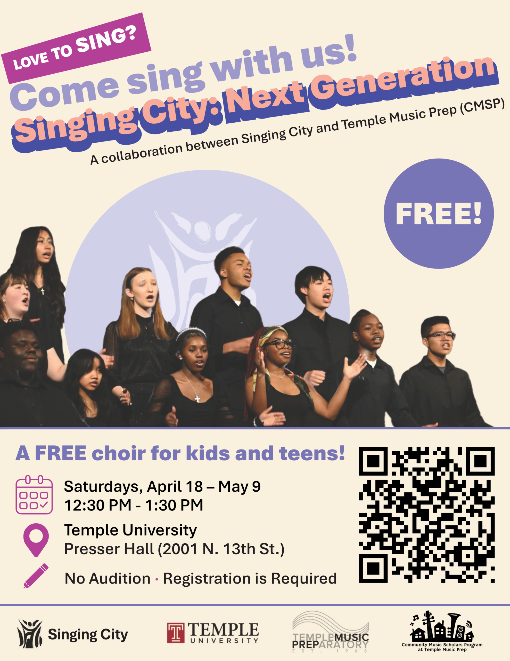 Singing City: Next Generation is a FREE choir for kids and teens, as part of a collaboration between Singing City and Temple Music Prep’s Community Music Scholars Program. Everyone is welcome- no audition required! Just come ready to sing, have fun, and make new friends.
