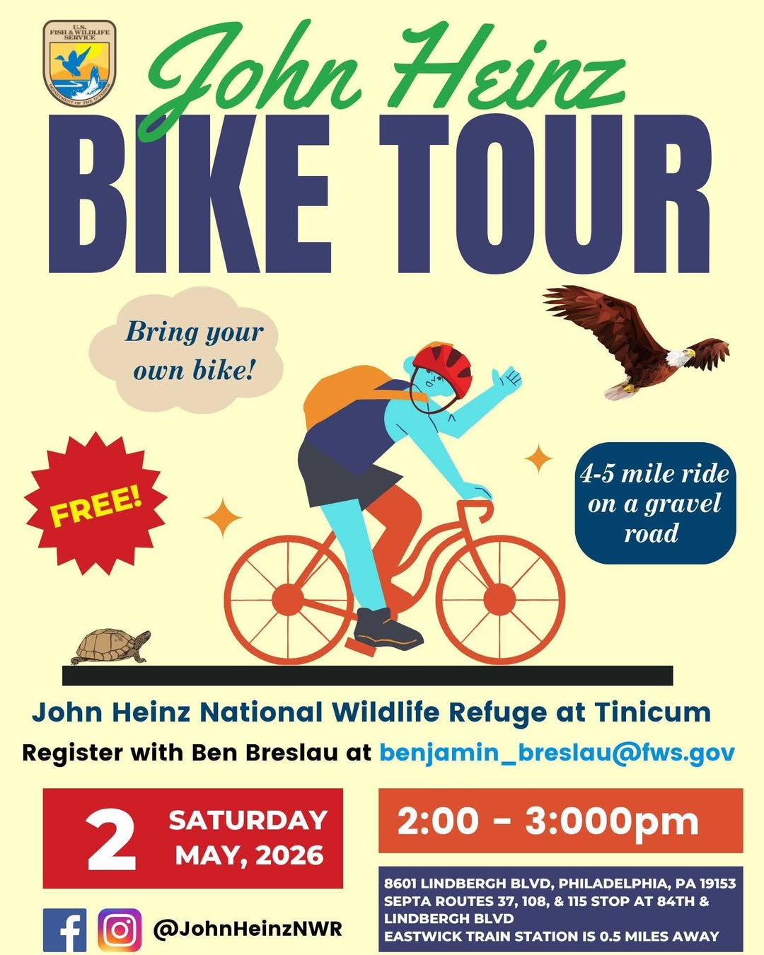 Join Ranger Ben for a Bike Tour around John Heinz NWR this Saturday 5/2 from 2 – 3 pm! Bring your own bike for this 4-5 mile ride on gravel trails. Register with Ben at benjamin_breslau@fws.gov