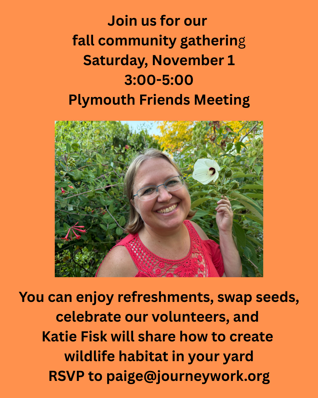 It is a time to celebrate what we have accomplished this season, give thanks to our tremendous volunteers, swap seeds, enjoy refreshments, and learn from our engaging speaker Katie Fisk about how we can invite wildlife into our yards. Please RSVP to paige@journeywork.org if you would like to attend.