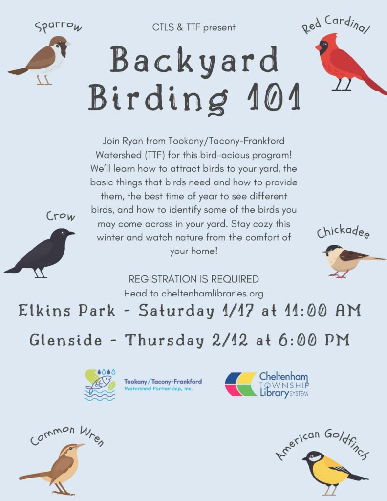 Join Ryan from Tookany/Tacony-Frankford Watershed (TTF) for this bird-acious program! We’ll learn how to attract birds to your yard, the basic things that birds need and how to provide them, the best time of year to see different birds, and how to identify some of the birds you may come across in your yard. Stay cozy this winter and watch nature from the comfort of your home!