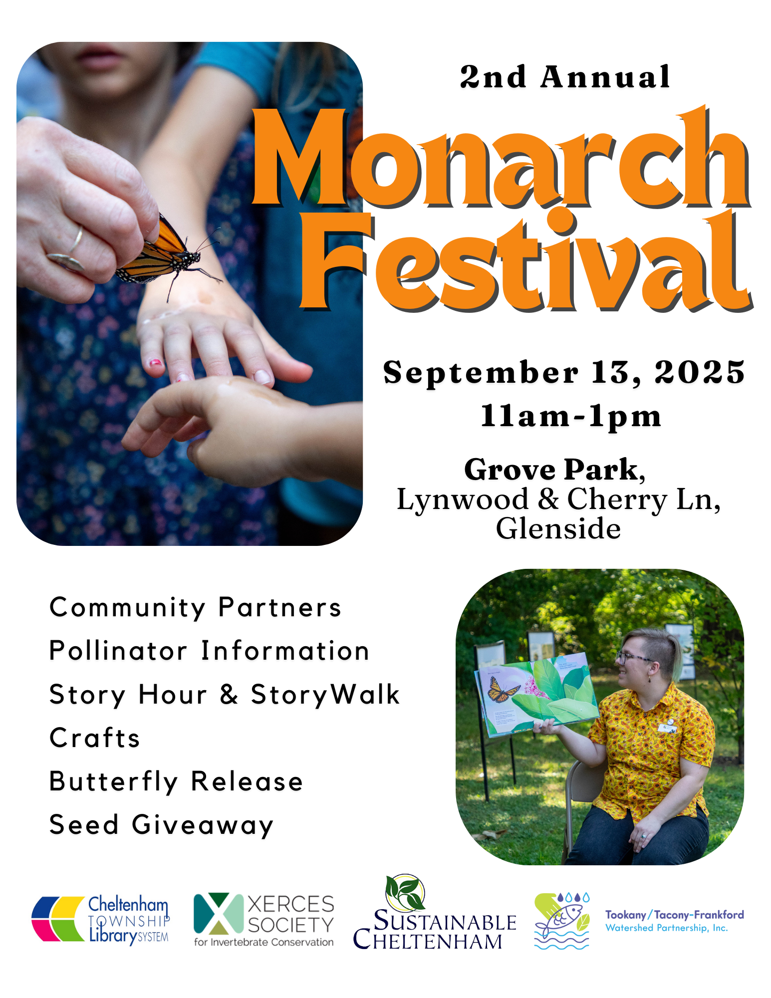 Join Cheltenham Township in our second annual Monarch Festival, spreading awareness of the importance of monarchs and other pollinators and celebrating the pollinator habitat planted last year in Glenside’s Grove Park! We’ll also have a butterfly release!