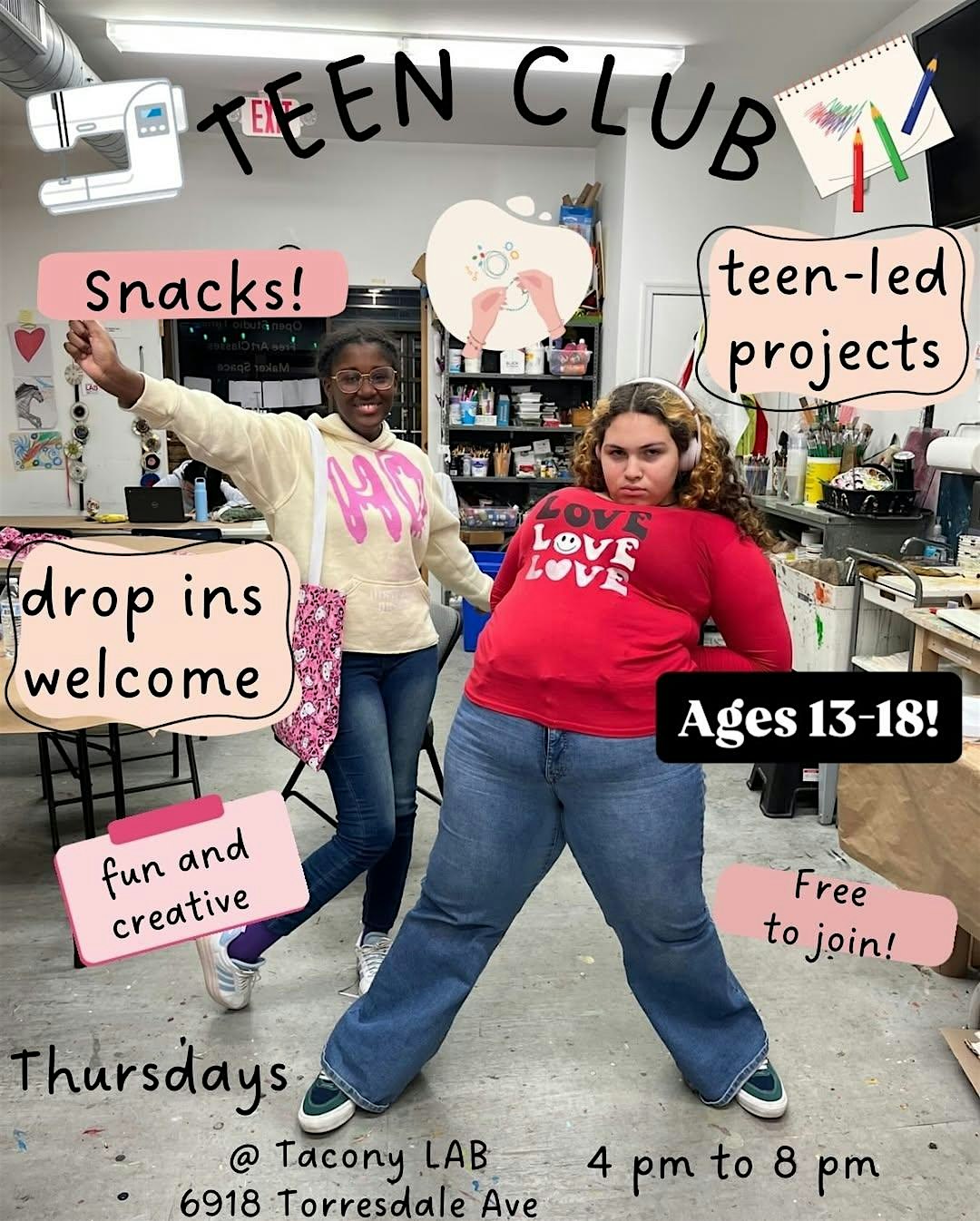 Learn about the Tacony LAB Teen Open Studio Hours. We have them weekly for ages 13-18. Pizza provided at this event