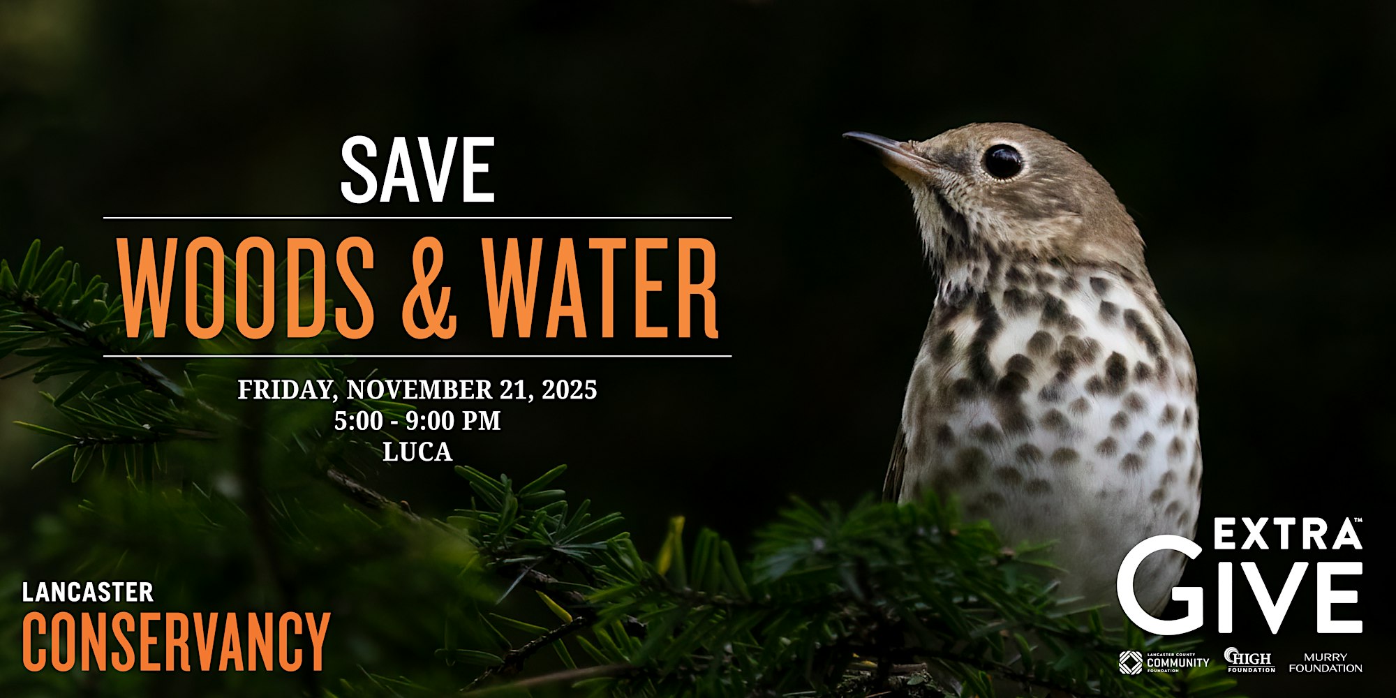 Stop by LUCA any time from 5:00 – 9:00 p.m. on November 21 to dine, drink, and donate to save nature as we celebrate the ExtraGive! Enjoy LUCA’s award-winning food and a fantastic drink on us while DJ Image spins tunes. We’ll also have a giving room set up to help you make your ExtraGive donations. Together, we can protect the beautiful woods and water that make our community such a wonderful place to live and explore! This event is free to attend, but we hope you will consider making a donation during the ExtraGive on Friday, November 21 to help us protect and restore our natural lands!