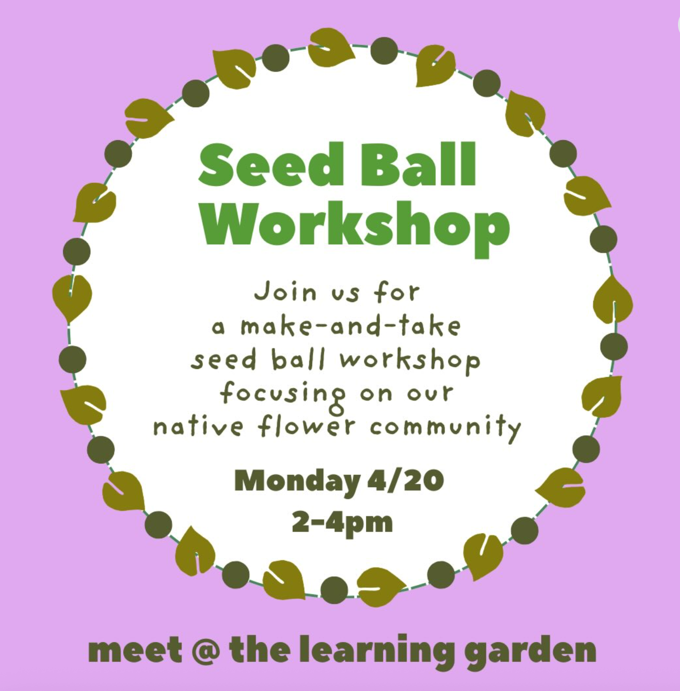 Create your own take-home seed balls while supporting our local native flowers and pollinators. Meet at the Learning Garden 4/20 at 2-4pm