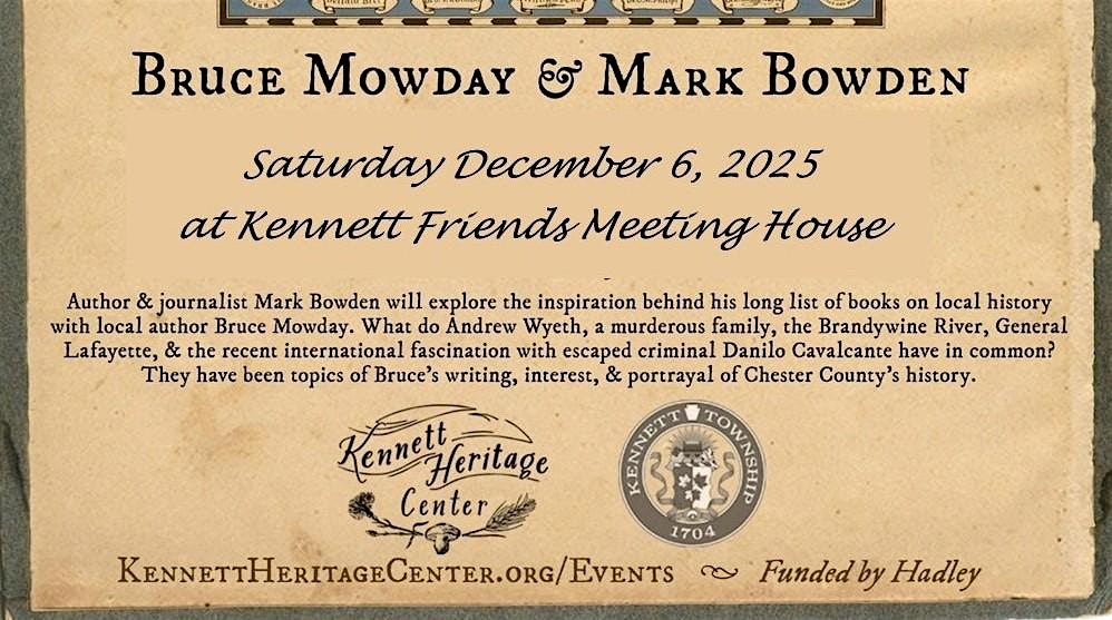 Author and journalist Mark Bowden will explore with local author Bruce Mowday the inspiration behind his long list of books on local historyWhat do Andrew Wyeth, a murderous family, the Brandywine River, General Lafayette, and the recent international fascination with escaped criminal Danilo Cavalcante all have in common? They have been topics of Bruce’s writing, interest, and portrayal of Chester County’s history.Saturday, December 6, 2025 at KENNETT FRIENDS MEETING HOUSE