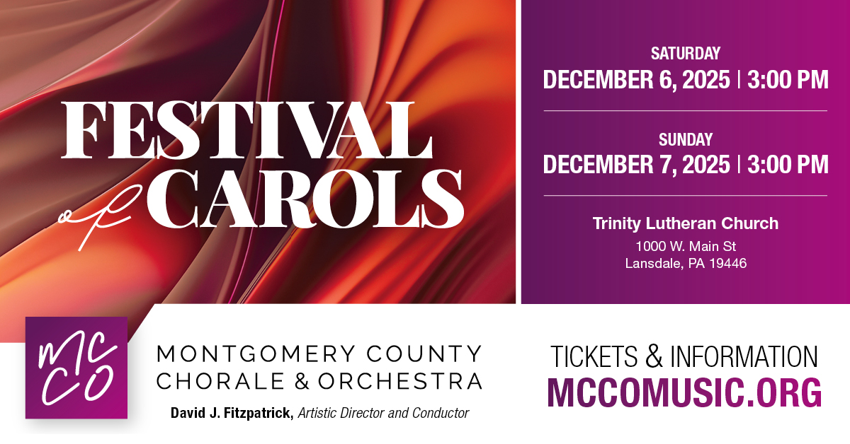 Montgomery County Chorale & Orchestra Presents: Festival of Carols Join us for our popular Festival of Carols concert — a celebration of the season featuring vibrant new arrangements of traditional carols, seasonal favorites, and reflective readings woven throughout the program. In addition, this concert will present the world premiere of Wake Up for choir, orchestra, and organ by internationally acclaimed Philadelphia-based composer Melissa Dunphy. Commissioned through MCCO’s Michael Kemp Fund for New Music, this piece is sure to be a memorable conclusion to this exciting concert. Saturday, December 6, 2025 3:00 p.m. Sunday, December 7, 2025 3:00 p.m. Trinity Lutheran