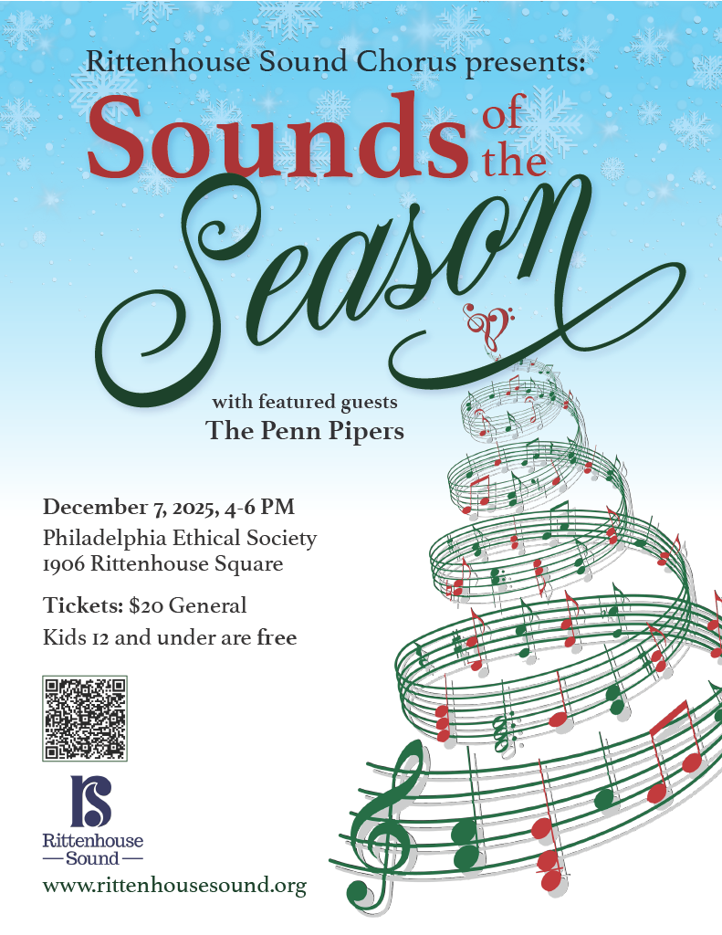 Join Rittenhouse Sound, Philadelphia’s premier a cappella chorus, at our upcoming “Sounds of the Season” concert on Sunday, December 7th, 2025. We’re spreading holiday cheer for all to hear, with chapter quartets and special guests The Penn Pipers. See you at 4PM at the Philadelphia Ethical Society on beautiful Rittenhouse Square!