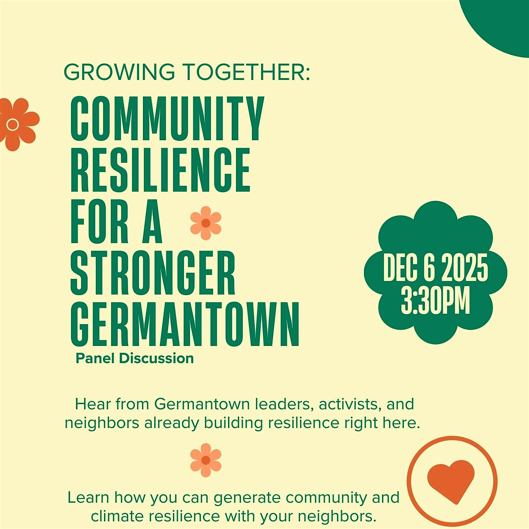 A panel discussion - Hear from Germantown leaders, activists, and neighbors already building resilience right here in our community.Join us for a panel discussion facilitated by Maleka Fruean, Germantown resident and GREAT member.Hear from Germantown leaders, activists, and neighbors already building resilience right here in our community. Learn how you can generate community and climate resilience with your neighbors.3:30 Snacks & refreshments & mingling4:00 - 5:30 Project info and panel discussion 5:30 - 6:00 More snacks & refreshments & mingling You can also get info about the Germantown Climate Resilience Planning project, which this event is part of.