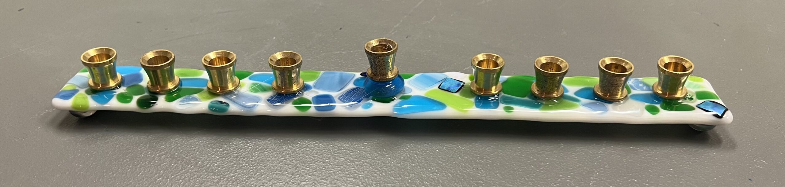 Fused Glass Menorah Class- Saturday December 6th, 1:00-3:30, $75 Explore fused glass to make a keepsake to use for your holiday celebration. You will learn how to cut design and decorate your project. It will be ready for pick up after firing. Elementary age children welcome to attend with a parent.​ Class held at Bella Mosaic Art in Mount Airy, Philadelphia.