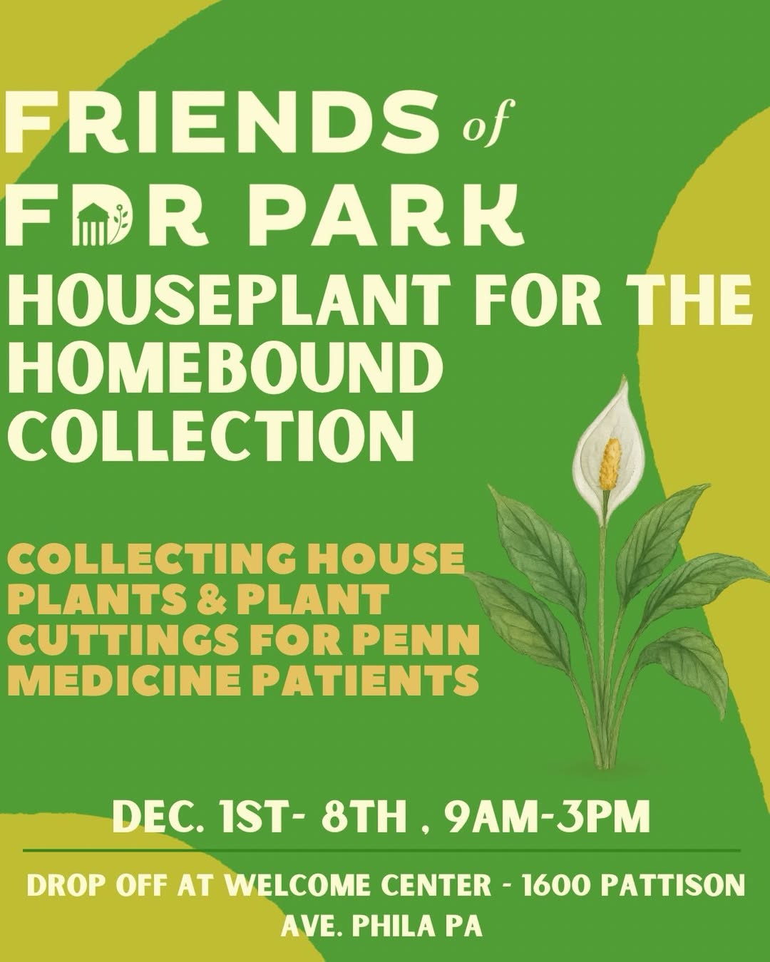 Our Houseplants for the Homebound quarterly collection is here Drop off your houseplants and plant cuttings at the Welcome Center this week, 12/1-12/8 any time between 9am-3pm. All plants will go to Penn Medicine for distribution.