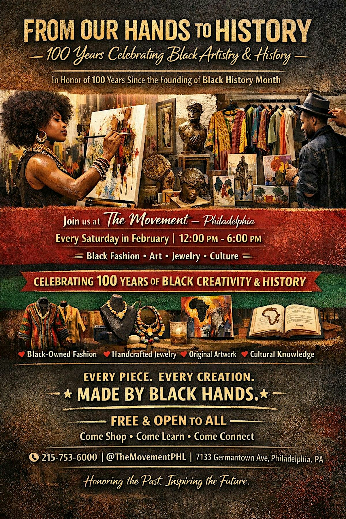 Celebrate a century of creativity, culture, and craftsmanship at the Black History Month Artisan Marketplace at The Movement Philly.Celebrate Black artistry every Saturday in February at The Movement Philly with artists and makers from across the country.Shop. Celebrate. Support Black creativity.#BlackHandsCreate #FromOurHandsToHistory #BHMMarketplace