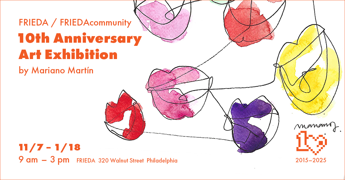 Join us for the opening cocktail reception of our 10th Anniversary exhibition! FRIEDAcommunity has commissioned Madrid-based artist Mariano Martín to create 294 illustrations each capturing a special moment in FRIEDA / FRIEDAcommunity’s 10-year history of cultivating meaningful and memorable connections. Visitors will be able to scan QR codes to discover the inspiration for these works. All artwork is available for purchase and all proceeds support FRIEDAcommunity. Mariano Martín is a Spanish artist, designer, and architect whose work blurs the line between disciplines. Mariano captures the poetry of everyday life through lines and color. For him, art is a way of
