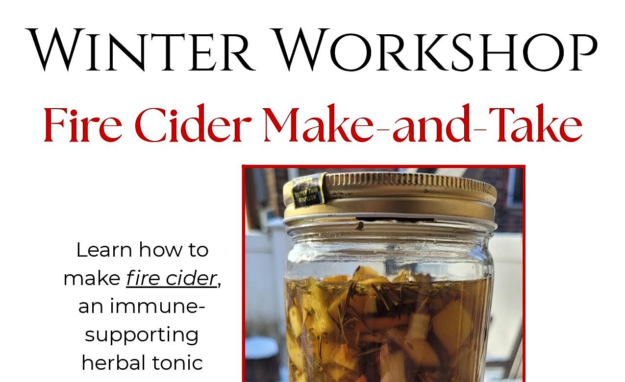 Learn how to make "Fire Cider", a wintertime immune-supporting herbal tonicFinish out the winter strong - this herbal medicine is said to help fight off wintertime sickness, as well as promote overall health and vitality. We'll teach you how to make it, and you'll take your finished product home after it is fully infused!Note: Fire Cider will take 4 weeks to infuse after preparation. We will notify participants when the tonic is strained and ready to pickup, likely around February 8th.