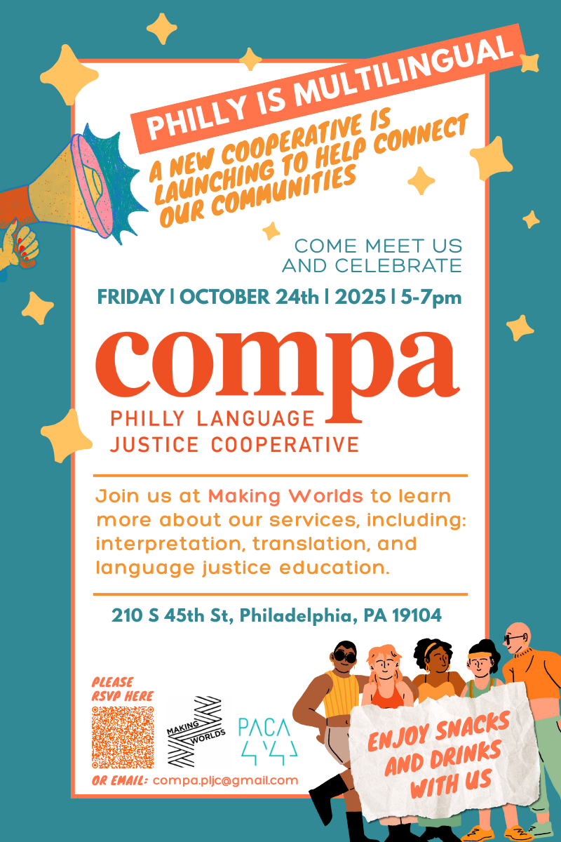 Making Worlds Bookstore & Social Center 210 South 45th Street, Philadelphia, PA, United StatesWelcome to the Compa Philly Language Cooperative Launch! Join us at Making Worlds Cooperative Bookstore & Social Center for an exciting event where we’ll be introducing our new language cooperative to the Philly community. Whether you’re a language enthusiast, someone involved in social justice movements, or just curious about what we do, this is the perfect opportunity to connect with like-minded individuals and learn more about our cooperative. Come celebrate with us and be a part of this special occasion!